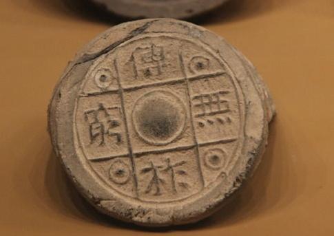瓦当,特指东汉和西汉时期,用以装饰美化和蔽护建筑物檐头的建筑附件。瓦当上刻有文字、图案,也有用四方之神的“朱雀”、“玄武”、“青龙”、“白虎”做图案的,是屋檐最前端的一片瓦为瓦当,瓦面上带着有花纹垂挂圆型的挡片。