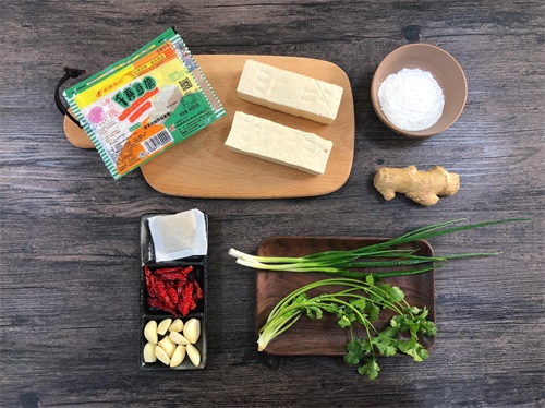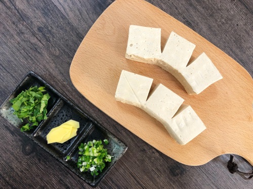 1、典发食品 “千页”豆腐切大块不切断,小葱、香菜切末、生姜切片