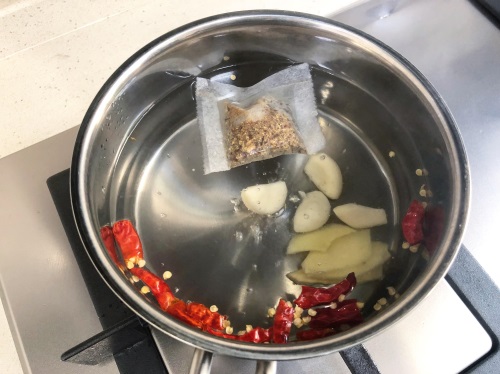 2、锅内加入适量水烧至沸腾,放入卤料包、干红辣椒段、大蒜头、老抽一起小火熬出香味