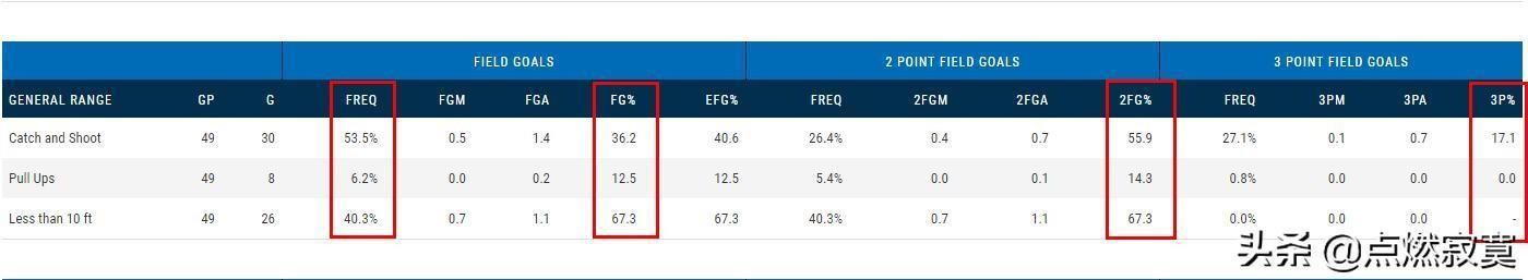 本赛季戈加-比塔泽场均得分3.1分,联盟排名第261位。场均内线得分1.6分,联盟排名第235位。场均二次进攻得分0.5分,联盟排名第232位。进攻效率102.4。从比塔泽的各项得分数据可以看出,比塔泽本赛季在进攻端的表现并不出色,而且他作为一名中锋场均内线得分仅有1.6分来看,这样的内线显然有些令人不满意。至于他的进攻效率更是有些低下,他在百回合内得分只有102.4分。接下来小编将从比塔泽在本赛季的出手分布和得分方式来具体分析一下他在本赛季进攻端的表现。