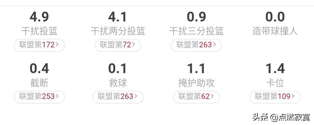再来看比塔泽在本赛季的拼抢数据,从比塔泽对于对手干扰投篮的整体上看,虽然场均4.9次的干扰投篮并不算十分优秀,不过也排在联盟的中上水平。要是具体细分的话,比塔泽对于对手两分投篮前的有效干扰做的非常优秀,场均4.1次的有效干扰处在联盟的优秀水平。但是对于对手三分投篮前的干扰则是做的非常糟糕,场均0.9次的有效干扰处在联盟的中下水平。究其原因,或许是比塔泽身为中锋经常在油漆区内防守的缘故,以至于和队友换防时对于对手在三分线外的投篮由于距离过远来不及形成有效的干扰。
