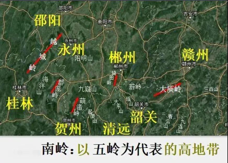 狭义的南岭指越城岭、都庞岭、萌渚岭