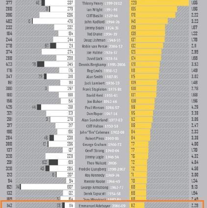 阿德巴约在温格的麾下成长之快令人咋舌:从法甲的璞玉,进球效率0.24球/场;到英超第三季的0.625球/场,小魔兽的愿景已成现实,丰满而令人继续期待。特别是第三季:07/08赛季,阿森纳在英超刮起的青春风暴,让无数球队望之侧目。