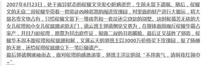 侯耀文去世后,发生了遗产案。幸亏有爱徒郭德纲的出手,才有了事情的解决。