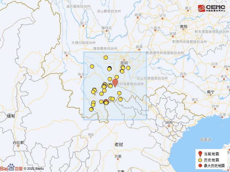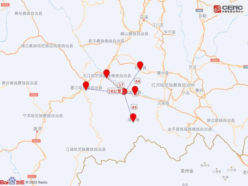 震中距红河县16公里、距元江哈尼族彝族傣族自治县37公里、距石屏县44公里、距绿春县44公里、距墨江哈尼族自治县58公里,距玉溪市113公里,距红河哈尼族彝族自治州114公里,距昆明市192公里。
