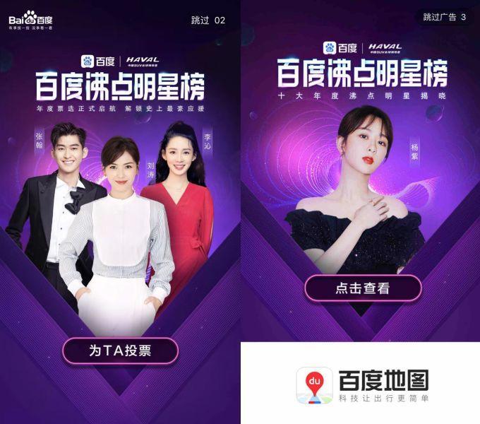 比如哈弗汽车、宝宝知道等品牌通过投放明星开屏,来“蹭”一波百度沸点明星榜的热度。不同于其他榜单是基于百度的大数据产生的,百度沸点明星榜是全网票选的结果,粉丝和网民的参与对榜单的生成起到了决定性作用。当自己投票的明星出现在APP开屏上时,用户自然会格外关注。