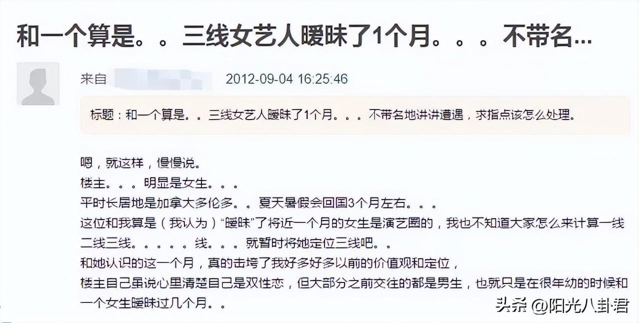 2012年,一条帖子在网络上流传开来,内容中,一位女网友自称在加拿大多伦多旅居时遇到一个三线女星,两人认识了一个月然后产生了感情。