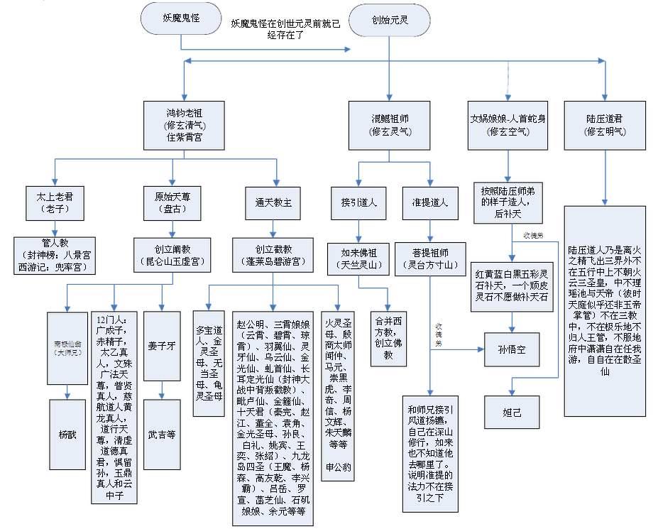 这就要从创始元灵说起了,他有四个徒弟分别是“鸿钧老祖、混鲲祖师、女娲娘娘、陆压道君”。鸿钧老祖又有三个徒弟,大徒弟太上老君,二徒弟元始天尊(开天辟地的盘古,有名的徒弟众多,包括文殊菩萨、太乙真人、姜子牙等)、三徒弟通天教主(他的弟子是最多的,滥竽充数的也多)。