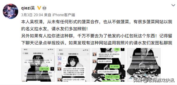对于此事茄子发微博称:吴权清,从没有任何形式与菠菜合作,也从来不做菠菜,有很多菠菜网站以我的名义拉水友,请水友加多辨别别!