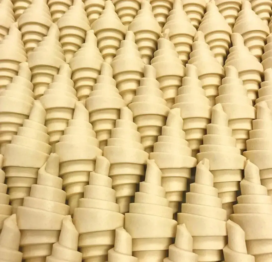 打个最简单的比喻,把片状油脂放在压面机上压薄,油脂不会开裂,而整块的油脂放在压面机压薄,油脂会容易开裂,做出来的产品层次不够清晰。做丹麦的油脂有片状黄油和片状酥油,使用片状黄油口感外表酥松奶香味浓郁,吃起来不油腻,不过片状黄油用来做丹麦是不太好操作的,因为油脂熔点较低很容易变软,不太好操控,但口感好且健康,片状黄油的熔点在28℃左右。