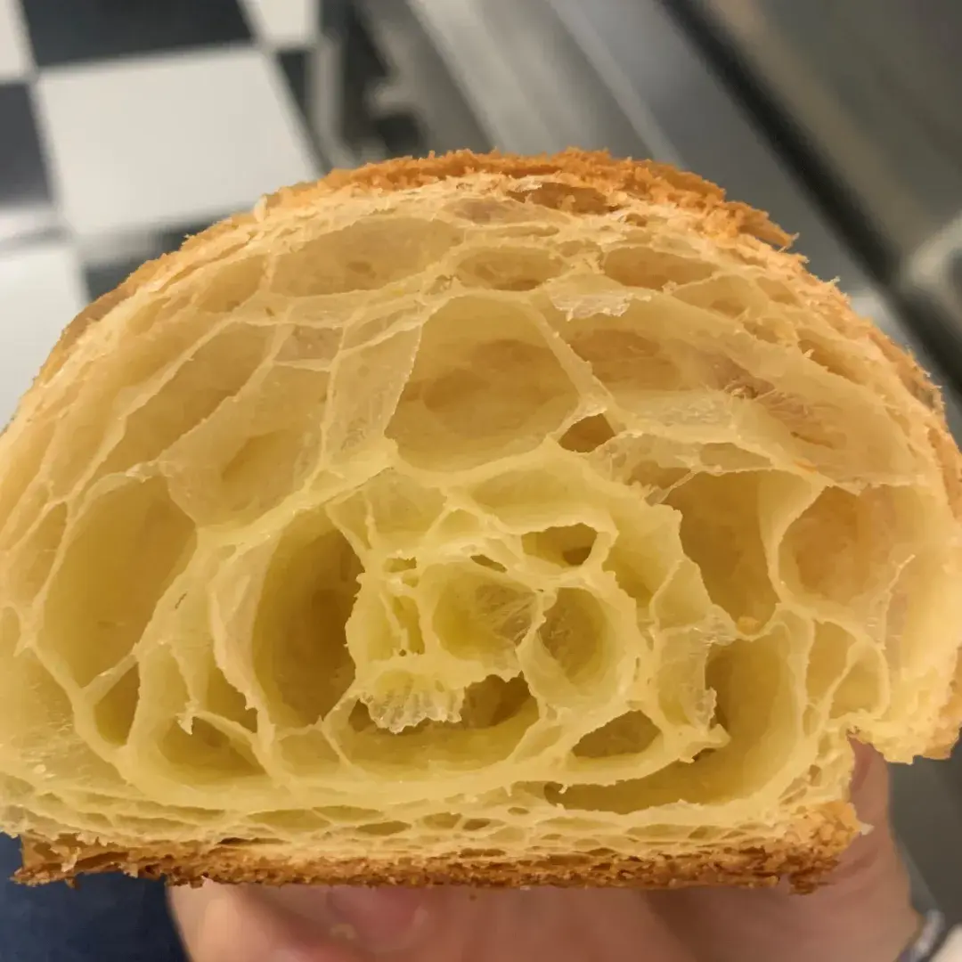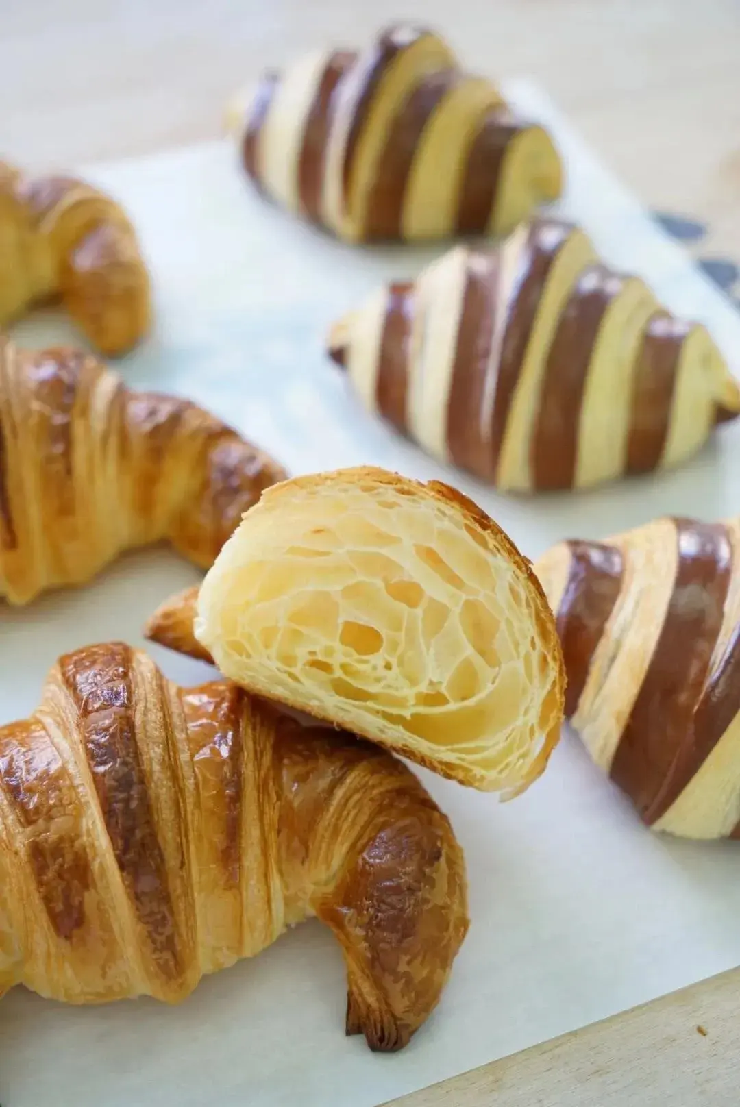 4、内部组织出现死面,往往是由于最终醒发温度过高或者发酵程度不够,也包括在开酥或者制作过程中手粉使用过多,都会导致最终内部组织不好。