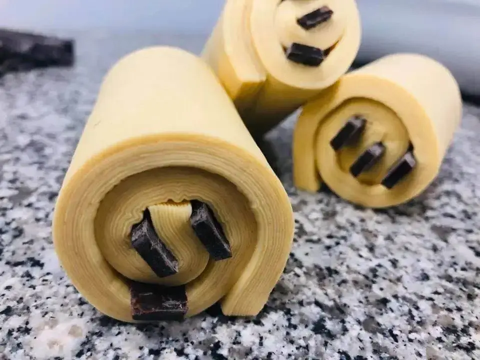 7.将面团切割成10*30cm的等腰三角形,从底部向上轻轻卷起,成可颂状。
