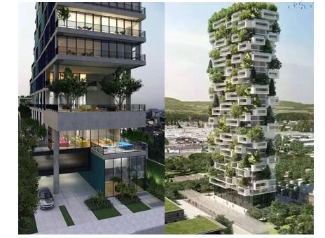 除了建筑外墙长满的植物外,每家还有一座两层楼高的空中室外私人小院,可种树、种花、种菜、遛狗、养鸟……使住在繁华城市中心的人们实现“家园”和“回归大自然”的梦想。