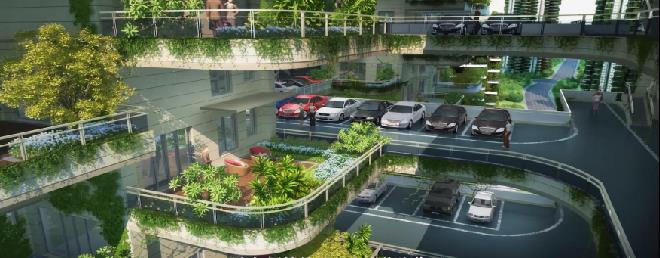 第四代住房只开挖主楼的基础部分做人防层及布置设备,不用再往下大开挖两三层建停车埸,可节省90%的地下工程量,缩短工期。住户车辆及访客车辆都可通过小区外围道路及智能载车系统,一分钟内开到所去任何楼层的公共院落里,停在所去屋前的停车位上,方便回家停车和驾车出行,解决停车难问题。