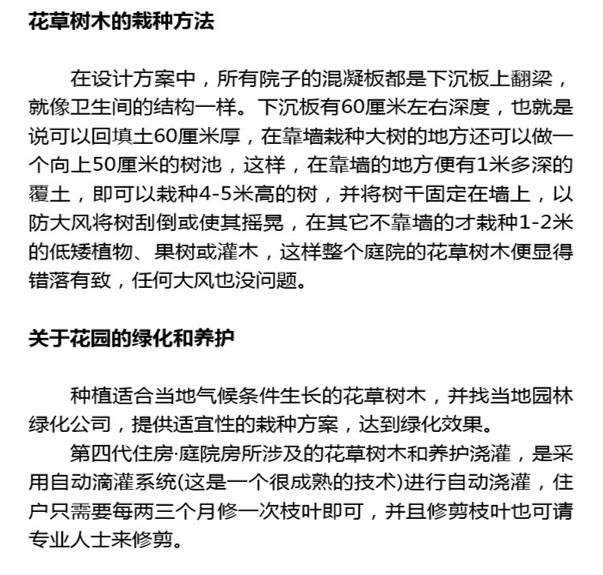 第四代住房采用了全球独具创新的知识产权技术:“庭院转换技术”和“楼层转换技术”, 该技术彻底解决了国内外所有类似建筑十几年来都无法解决的“黑房子”技术难题,使所有主 要房间都能直接采光,使所有花园庭院都有了私密性和安全性,这是到目前为止全球其它所有 类似建筑都无法做到的,并这些技术完全属于中国自主创新技术。