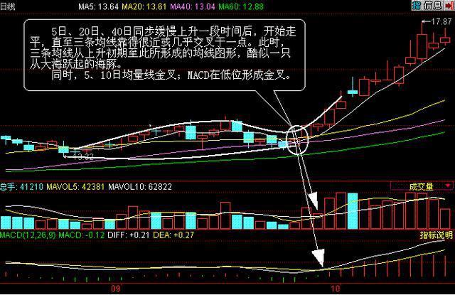 股价沿上升通道运行,日K线均线(5日、20日、40日)同步缓慢上升一段时间后,开始走平,直至三条均线靠得很近或几乎交叉于一点。此时,三条均线从上升初期至此所形成的均线图形,酷似一只从大海跃起的海豚,而60日均线走平或拐头向上,形成多头走势。如下图: