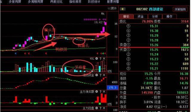 智能辅助线朝上,年线朝上,代表股价中短周期均向好,给个股向后市展开行情打好基础,股价短期冲高形成鸭脖颈;冲高见顶后,形成鸭头顶;回落到无量状态形成鸭鼻孔,再度放量突破,鸭子张口,很典型,很形象。