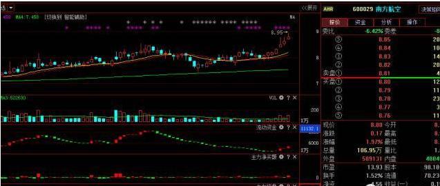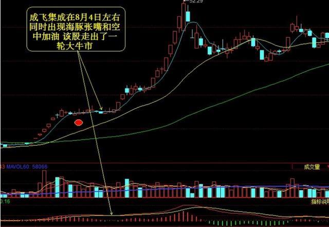 案例:成飞集团(002190)在2015年8月4号左右先后出现了海豚嘴和空中加油,这明显是牛股起爆的信号,在之后的半个多月里,涨幅最高达到了90%
