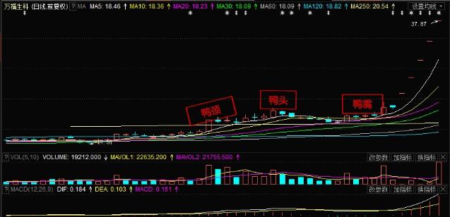 形态上就是,盘中主力吸筹造成三条均线上行,5日与10日均线缩量下行是主力洗盘行为。等它们再次金叉,主升浪开始。日均线上穿10日均线所形成的图形,很像个鸭头,称之为老鸭头形态。