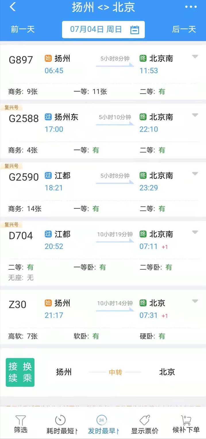 7月2日22:48分从北京南始发的G895次列车驶入扬州站站台,在扬州停留一晚后,于今天上午6:45出发(G897),返回北京南站,到达北京南的时间为中午11:53。