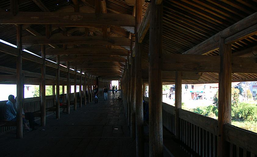 条石错缝平砌桥墩,墩宽均为2.80米,南向有分水雁翅,墩上木梁双向平衡展出,逐层加距伸出,纵铺桥面。桥上廊屋42间,重檐顶。当心间屋顶升起,为歇山顶,翼角起翘。1991-1999年曾多次维修加固