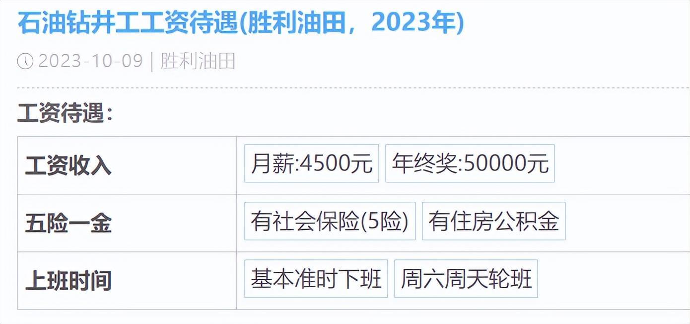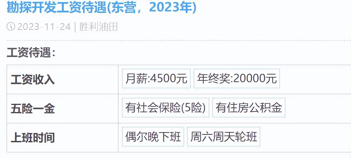 这位胜利油田员工,岗位是石油钻井,工作地点东营,月薪4500元,年终奖50000元。