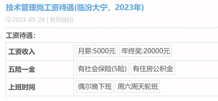 这位胜利油田员工,岗位是技术管理,工作地点临汾,月薪5000元,年终奖20000元。