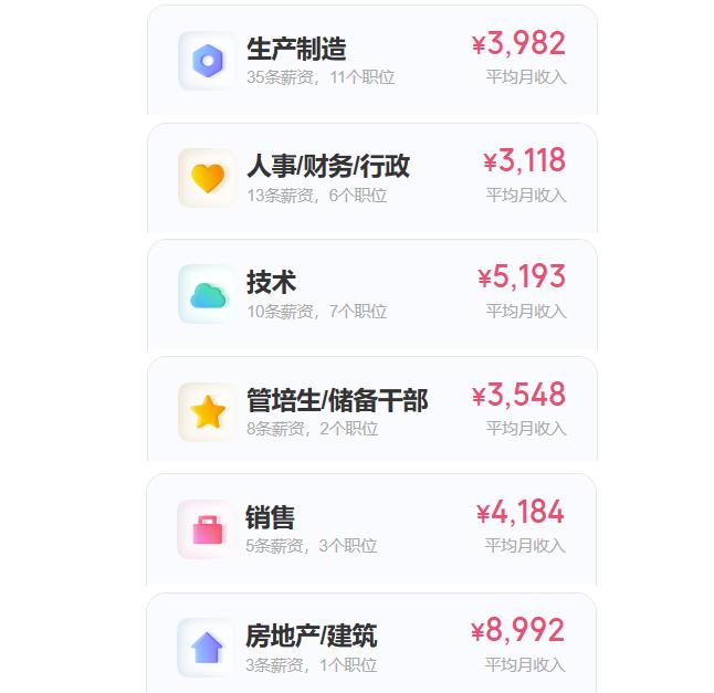 我们看一下不同岗位的平均月收入情况:技术岗位平均月收入5193元,生产制造岗位平均月收入3982元,管培生岗位平均月收入3548元,人事/财务/行政岗位平均月收入3118元,销售岗位平均月收入4184元,房地产岗位平均月收入8992元。