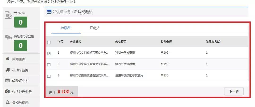 登录后,选择“机动车业务”→“驾驶证业务”→“考试费缴纳”,勾选想要缴纳的考试费科目,点击“下一步”。