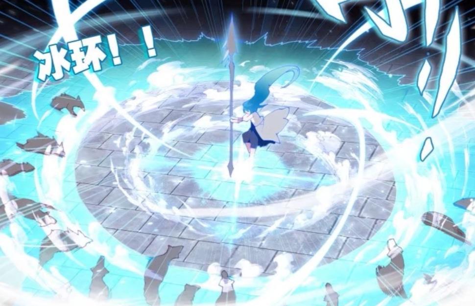 最后一张图是这样的,冻千秋提着她的长枪,用枪柄狠狠向地砸去,这是冻千秋要发动技能的情况。而冻千秋的周围出现了一圈一圈的冰环,将四周的熔岩犬都给打败了。这一招的威力还是挺大的,可是冻千秋这个姿势本来是很霸气的,可是与冻千秋的女神形象还是有些不符合的。
