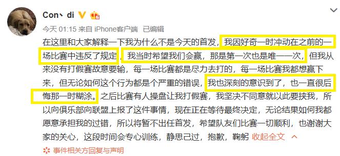 本来很多观众们对condi的所作所为就非常不满了,但是谁都没想到还没过两年condi再次出现大问题,而这次竟然是玩菠菜。在今天凌晨的时候condi自己就“解释”了自己为什么没有首发的原因,然而细心的观众们一下子就看出来了其中的猫腻,因为其中的话语让诸多人感觉到了打假赛的嫌疑,也就是这个时候关于condi打假赛的可能性瞬间提高,直到今天下午4点的时候官方给予了处罚才全面皆知,而与此同时LGD战队也对condi进行了处理,直接将其踢出LGD战队。