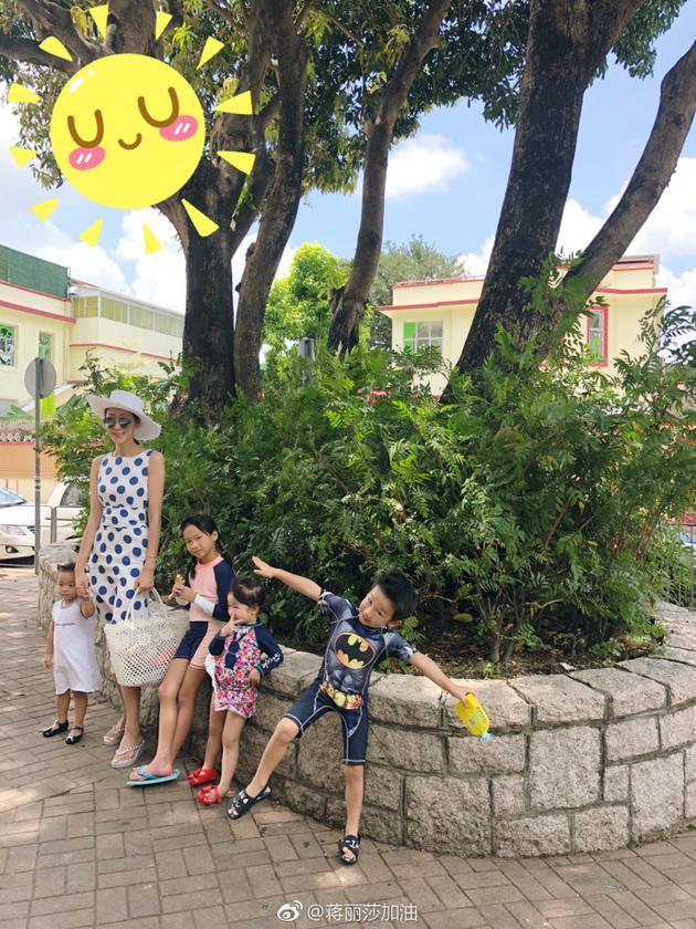 蒋丽莎微博上大部分都是在晒孩子,还经常一拖四。照片中,她身穿白底蓝色波点连衣裙,头戴草帽,面带黑超,身材苗条,完全是一副辣妈模样。在她身边,四个儿女摆出造型,十分可爱。