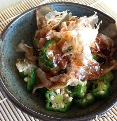 在日本,秋葵是常吃的蔬菜,最流行的吃法是白灼后冰镇,配上芥末、木鱼花,蘸酱油吃