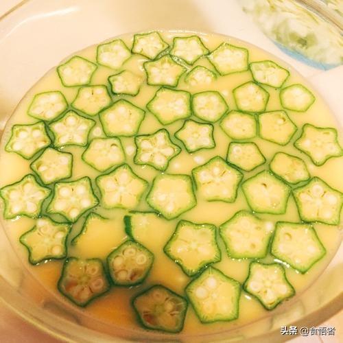 秋葵改刀成薄片,鸡蛋加水和调味料,油一起搅散。再把秋葵片放鸡蛋液上面,锅里水烧开,放入蒸锅旺火足气蒸7分钟左右即可。