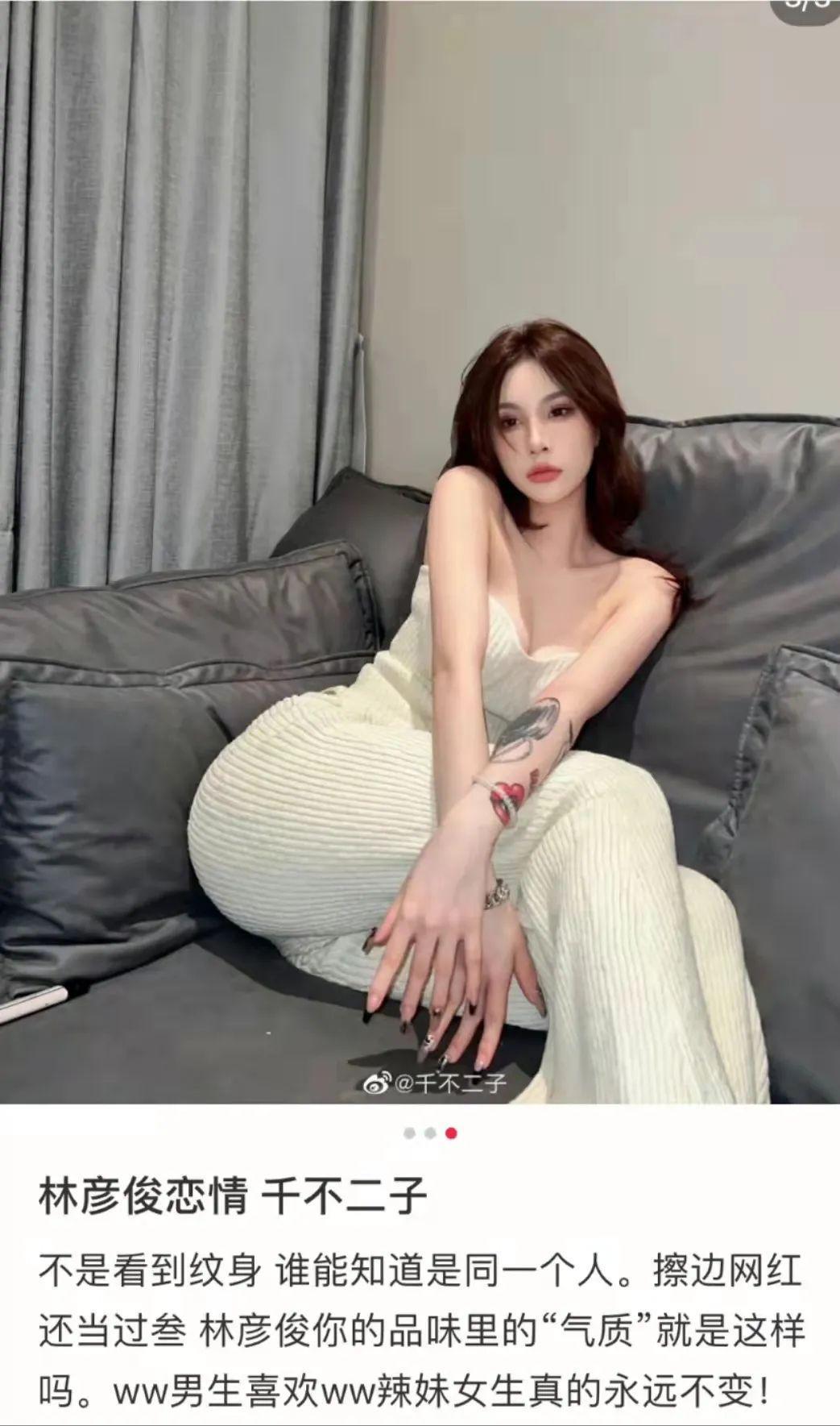 根据网友扒出的信息,这位女主的网络生活还是比较丰富,诸如“整容、当小三、擦边、心机深”等负面标签全被网友贴了上去。网友称,女主名叫千不二子,和林彦俊是老乡,都是台湾省人,女方是标准的台妹。恋情曝光后,女方就把所有社交账号清空,不知是想屏蔽掉不友好的声音还是怕被扒皮。