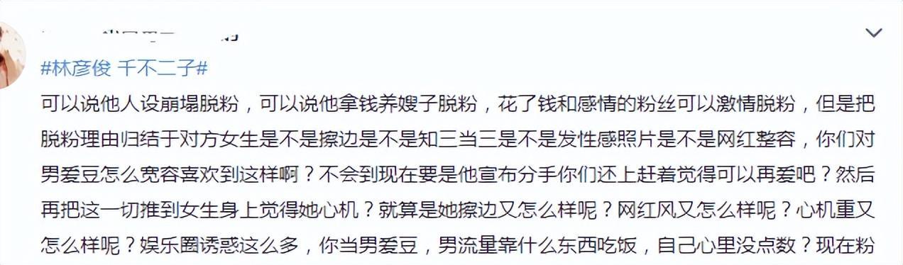 对于粉丝的行为,很多网友也觉得莫名其妙,脱粉是个人原因,确切说是林彦俊的行为伤害了粉丝。可是,粉丝为何追着女主不放?是林彦俊人设崩塌,是他经历“雪藏”、“复出”之后,不好好搞事业,莫要把无辜的女方牵扯进来,称是女方不够优质才导致脱粉。