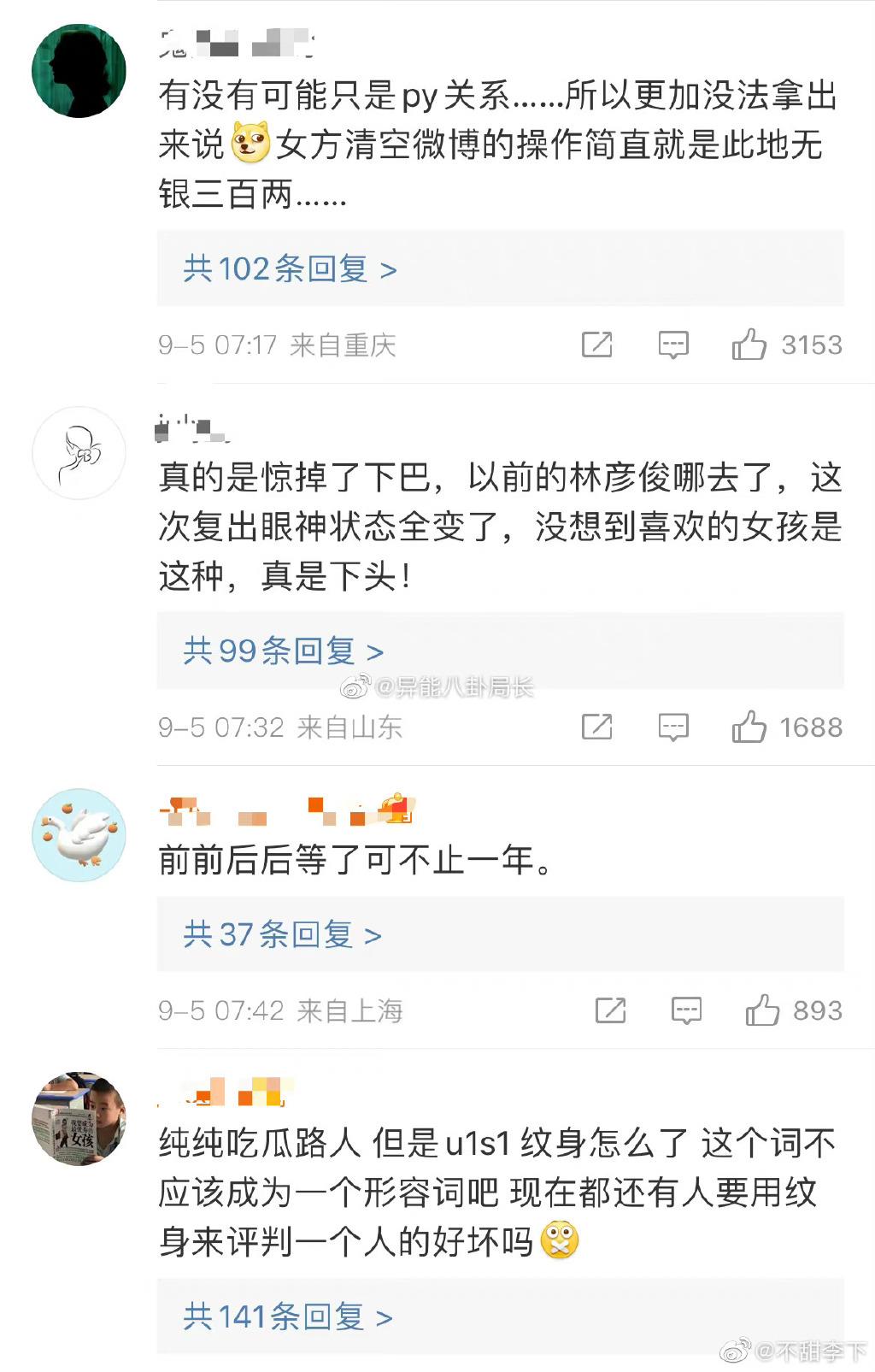 其他网友看到女方被扒出的这些信息就表示惊呆了下巴,疑惑以前的林彦俊去哪里,复出之后眼神都变了,还称两个人可能就是普通的“睡觉”关系,就也没有办法拿出来说,而女方清空账号的操作是此地无银三百两。不过,也有网友称用“纹身”等给人定性也不靠谱,都什么时代了,纹个身就是坏人了。
