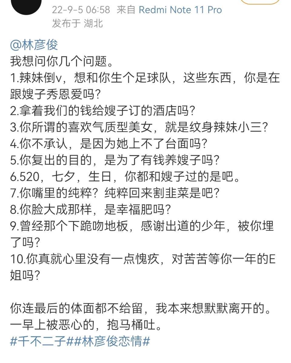 而粉丝真的破大防了,知晓女方被扒情况后比看到恋情曝光还难受,纷纷表示几年时光错付,脱粉。有粉丝发了十问,其中8问都跟女主角相关。怀疑林彦俊的“辣妹倒V”手势是跟嫂子秀恩爱,拿粉丝的钱给嫂子定酒店。