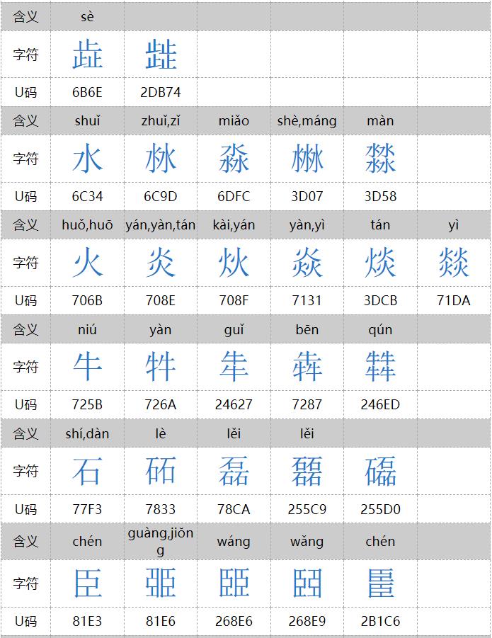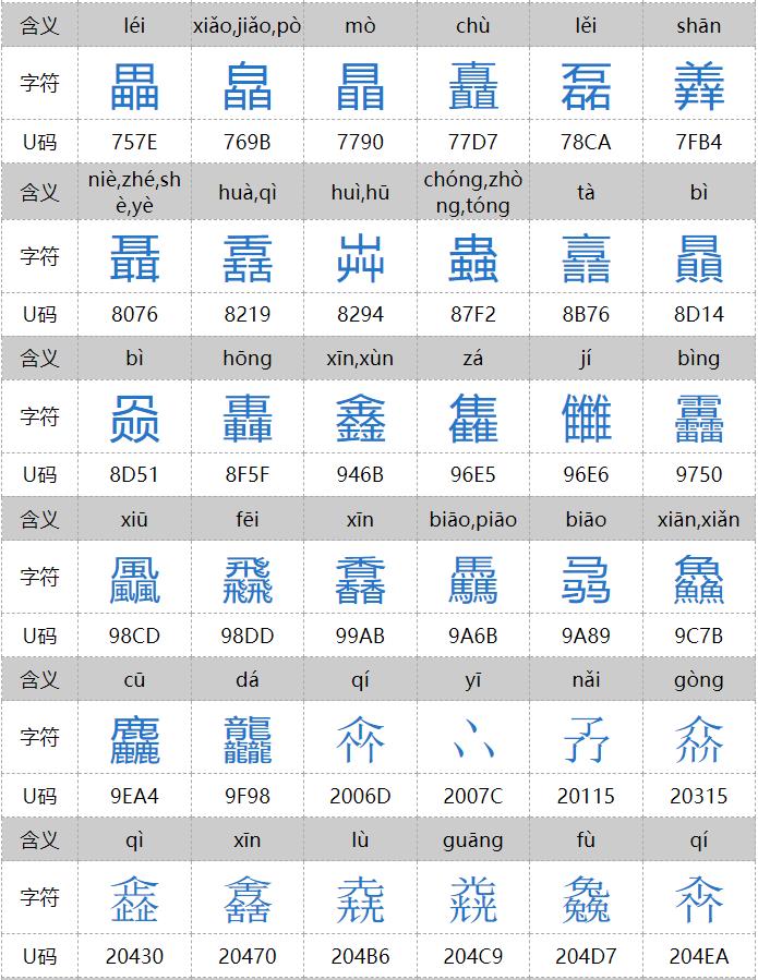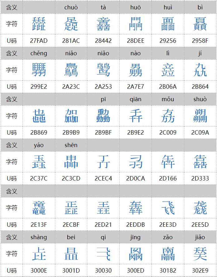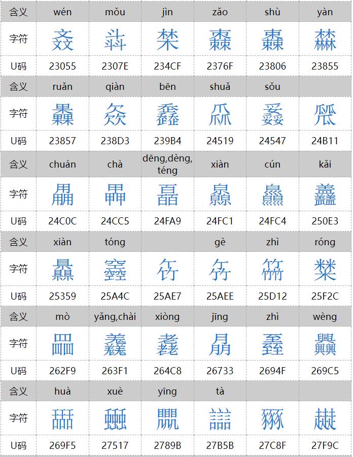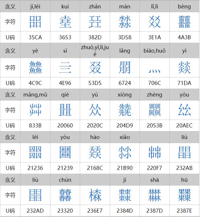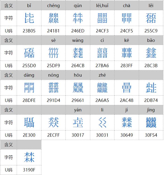 㐨、㐩、㒭、㒹、㕛、㚁、㚐、㚘、㚡、㚣、㝇、㣈、㯤、㯥、㱛、㲎、㸞、㹜、㼌、㽬、㿟、䀠、䎜、䖵、䡛、䣈、䨇、䪭、䬕、䲆、丽、兓、兟、兢、册、冐、出、卌、卝、厸、吅、喆、囍、夶、奻、孖、屾、幵、幷、弜、弱、戔、斦、棗、棘、槑、歰、比、沝、炎、炏、燚、爻、牪、玆、玨、甡、畕、皕、砳、祘、秝、竝、競、竸、聑、臦、臸、艸、芻、騳、龖等三百多个,太多,就不全放这里了。