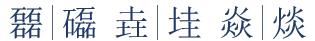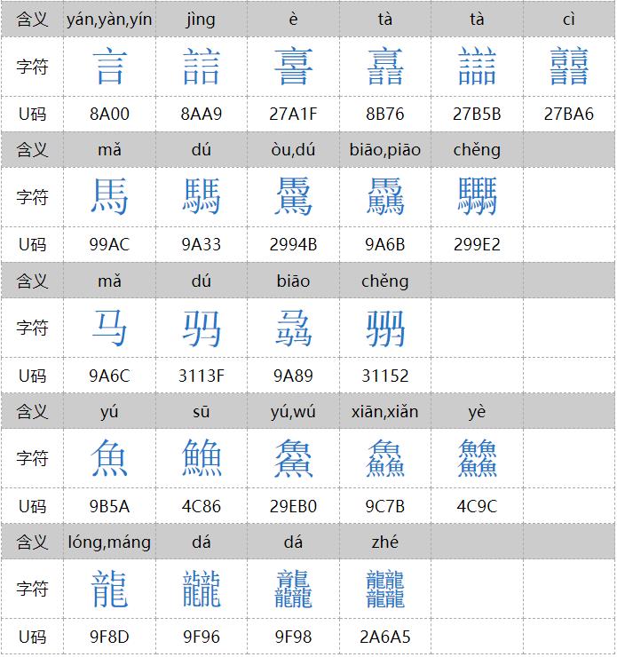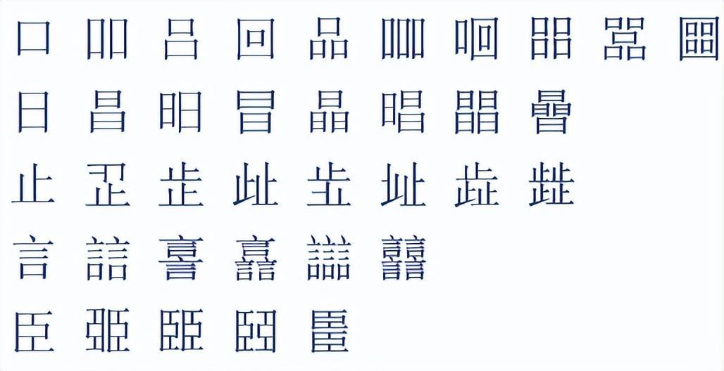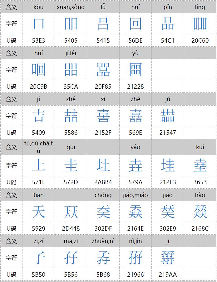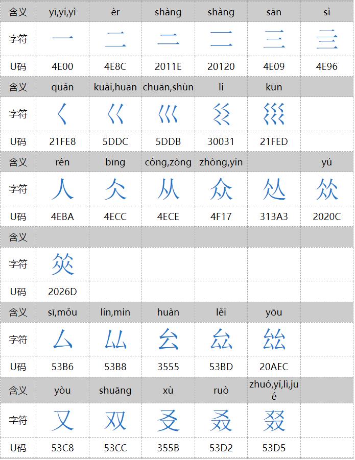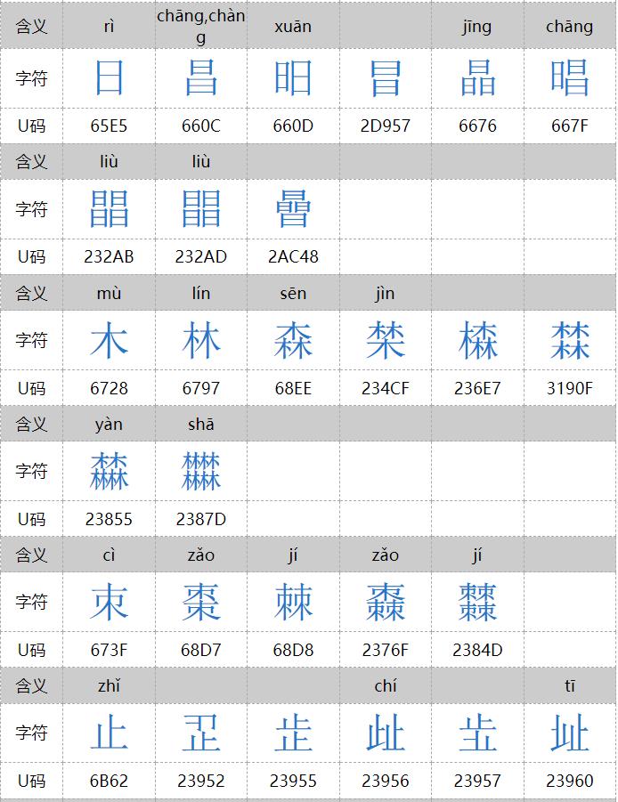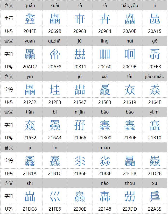 㐨、㐩、㒭、㒹、㕛、㚁、㚐、㚘、㚡、㚣、㝇、㣈、㯤、㯥、㱛、㲎、㸞、㹜、㼌、㽬、㿟、䀠、䎜、䖵、䡛、䣈、䨇、䪭、䬕、䲆、丽、兓、兟、兢、册、冐、出、卌、卝、厸、吅、喆、囍、夶、奻、孖、屾、幵、幷、弜、弱、戔、斦、棗、棘、槑、歰、比、沝、炎、炏、燚、爻、牪、玆、玨、甡、畕、皕、砳、祘、秝、竝、競、竸、聑、臦、臸、艸、芻、騳、龖等三百多个,太多,就不全放这里了。