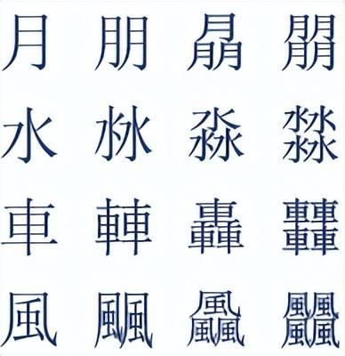 叠字通常是叠两次、三次、四次,两字通常左右结构,三字通常品字结构,四字通常田字型。如: