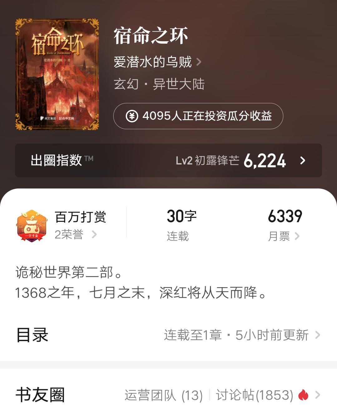 爱潜水的乌贼新书《宿命之环》已经在起点开启预收藏的活动了,阅文各个渠道也进行了相关的新书宣传,不知道你是否参与进去了呢?