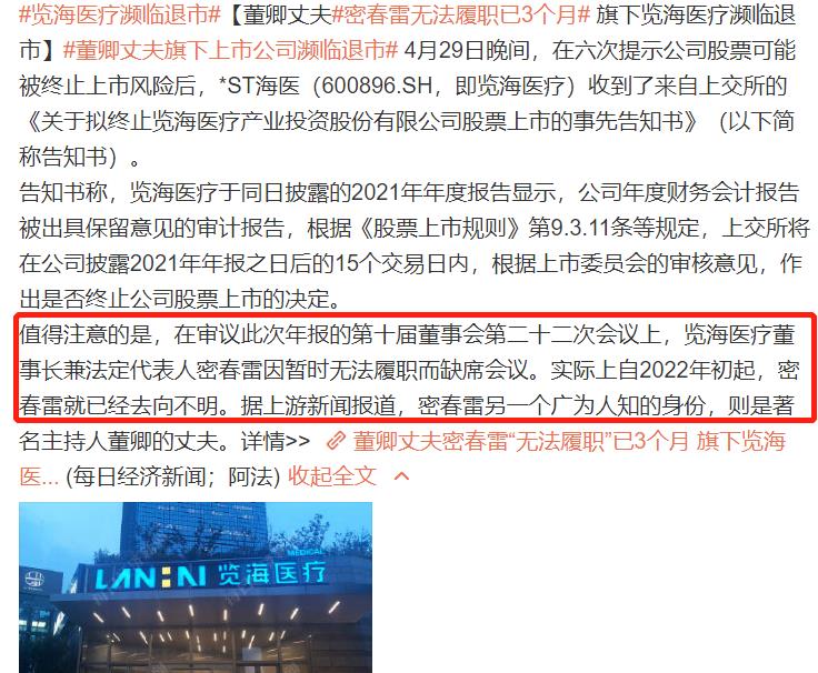 在今年五月份,有媒体曝出关于央视著名主持人董卿的丈夫密春雷无法履职已经3个月,旗下的一家上市公司已经收到了6次提示公司股票可能被终止的上市风险,当时就有传言称已经影响到了董卿,但从之后的情况来看,似乎董卿的事业并未受到很大影响。