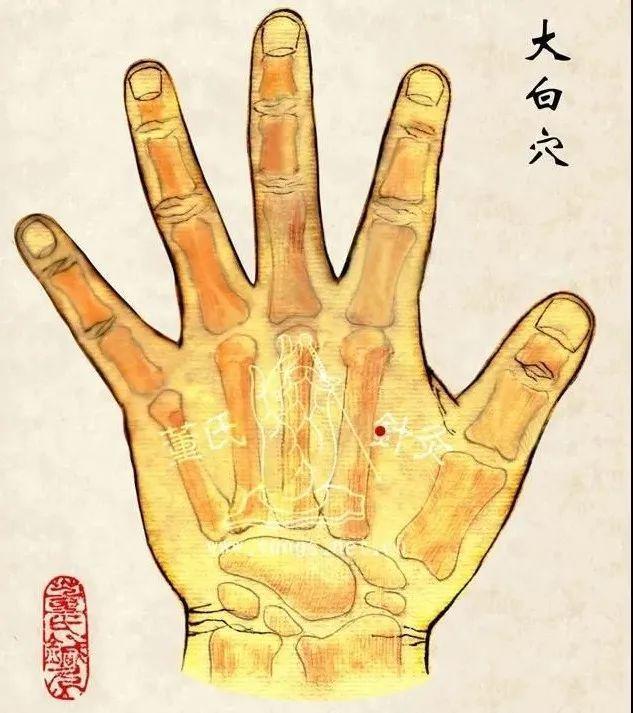 【大白】:手背第一掌骨与第二掌骨之间,距灵骨穴一寸