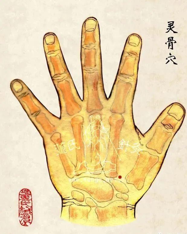 【灵骨】:在手背虎口、拇指与食指叉骨间,即第一掌骨与第二掌骨接合处。与重仙穴通。
