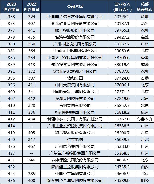 中国中车集团有限公司排名世界第434位,铜陵有色金属集团控股有限公司排名世界第436位;