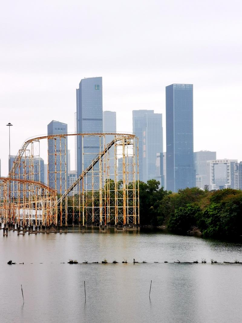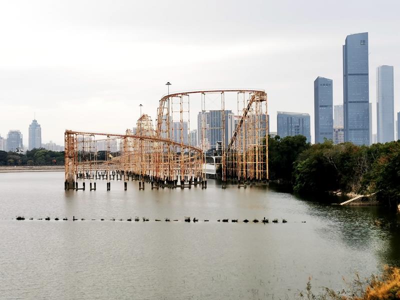 香蜜湖当年有多热闹?这样说吧,如果你当年开车路过深南大道,香蜜湖这个路段经常堵车,而且排队进入香蜜湖的市民游客会排到深南大道。那个时候香蜜湖娱乐城,香蜜湖水上乐园,一到节假日可谓人山人海,热闹非凡。但现在,那已经成为过去了,只剩下一些高大雄伟的娱乐设施静静地矗立在湖水中和香蜜湖周围,如上图中的水上过山车,它曾经是亚洲最大的水山过山车,要想坐一趟,也要排队好长时间,还有摩天轮和海盗船,曾经给我们带来了太多快乐的瞬间和记忆。