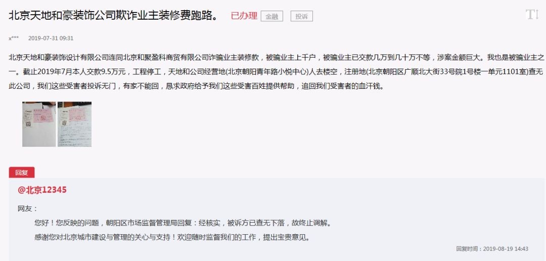 通州的谢女士为装修新房,向北京天地和豪装饰设计有限公司分两次缴费三十万六千五百三十元。6月23日,房子还未装修,但谢女士去“天地和”公司索要施工图纸时,却发现无法联系到负责人。天地和公司经营地(北京朝阳青年路小悦中心)人去楼空,注册地(北京朝阳区广顺北大街33号院1号楼一单元1101室)查无此公司。这时,很多和谢女士有相同处境的消费者也在苦苦寻找能为他们负责的人。