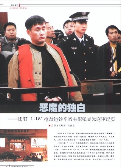 王野郊,王贵廷,恶魔的独白——沈阳“1.18”抢劫运钞车案主犯张显光庭审纪实中国审判 . 2007 (02)
