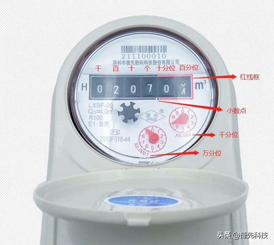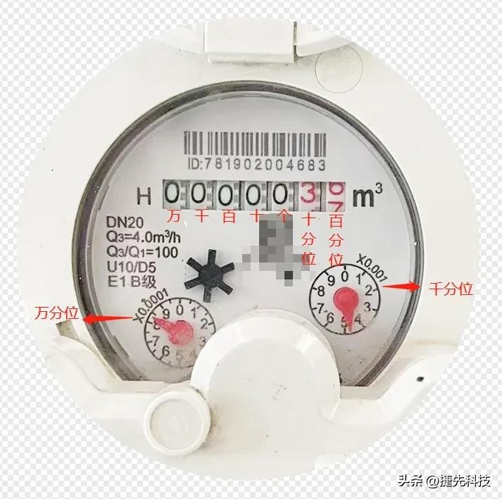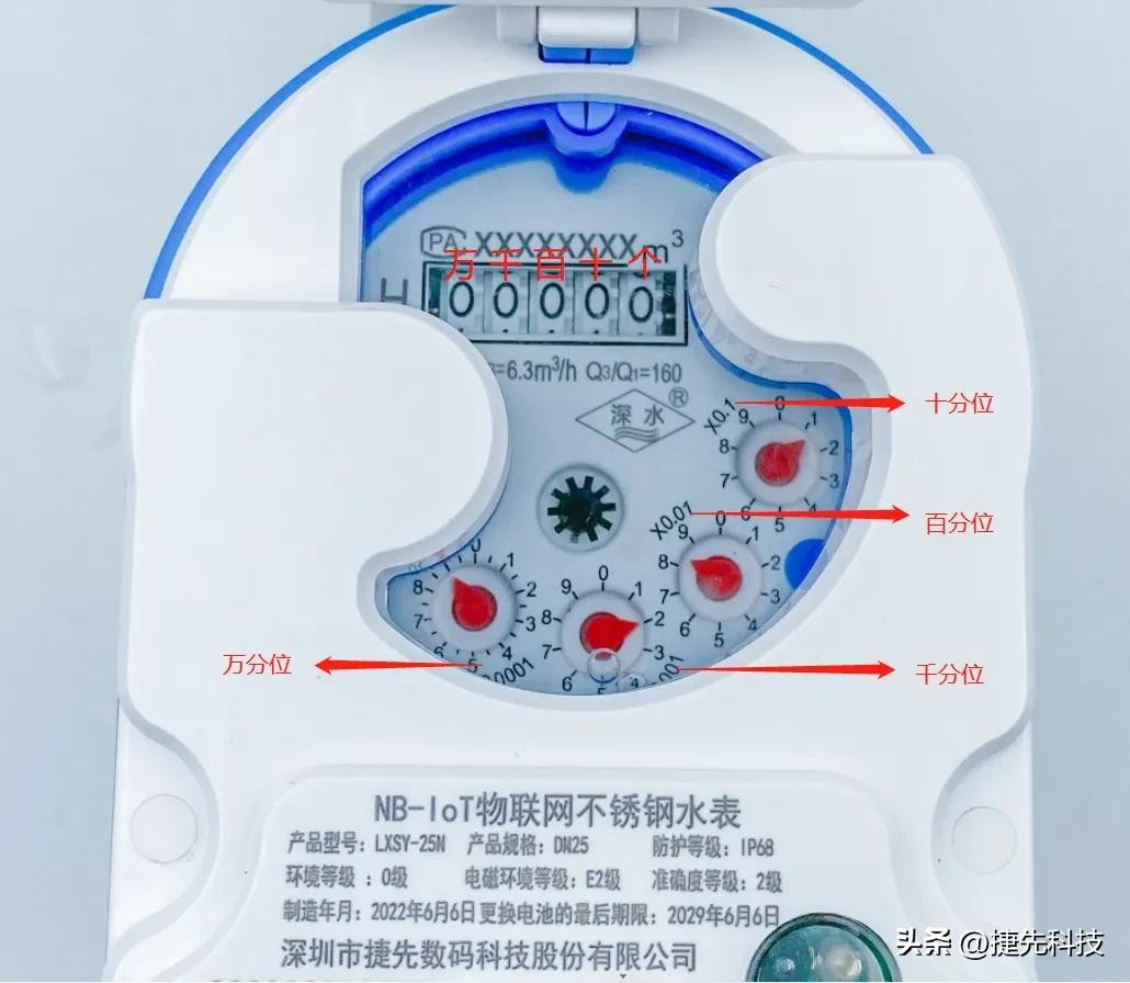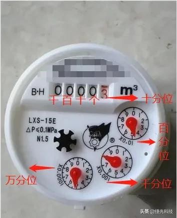 字轮六位数:从左到右的数字分别对应着千位、百位、十位、个位、十分位、百分位,字轮小数部分用红线框、小数点来表示,指针部分则变成从千分位到万分位。有的水表也会直接用红色数字和在旁边标注“X0.1”表示小数,指针部分则是从百分位到万分位。